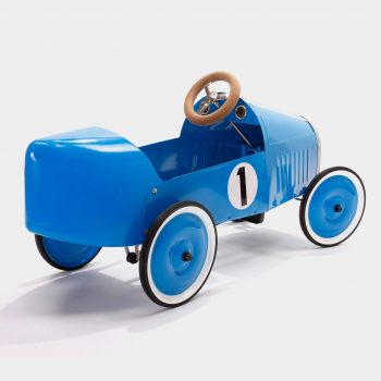 Your little one will feel like Miss Daisy in this pretty pink, 1926 inspired pedal car. The dusty-flamingo finish extends down to the wheels creating one little car that demands attention. Large rear wheels mean this car can scoot from grass to path with ease. It features a beautifully detailed white box-padded seat, headlights, dashboard instruments, a chrome rail and a vintage number plate.