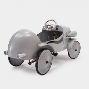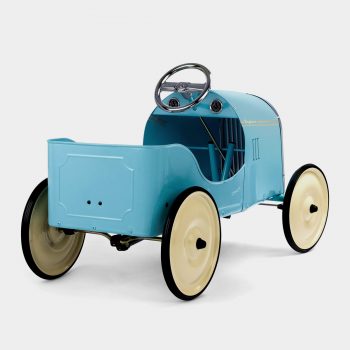 Your little one will feel like Miss Daisy in this pretty pink, 1926 inspired pedal car. The dusty-flamingo finish extends down to the wheels creating one little car that demands attention. Large rear wheels mean this car can scoot from grass to path with ease. It features a beautifully detailed white box-padded seat, headlights, dashboard instruments, a chrome rail and a vintage number plate.