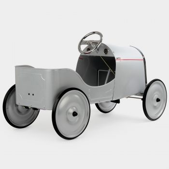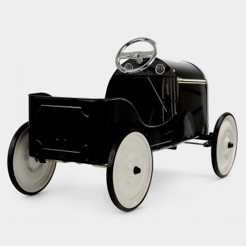 Your little one will feel like Miss Daisy in this pretty pink, 1926 inspired pedal car. The dusty-flamingo finish extends down to the wheels creating one little car that demands attention. Large rear wheels mean this car can scoot from grass to path with ease. It features a beautifully detailed white box-padded seat, headlights, dashboard instruments, a chrome rail and a vintage number plate.