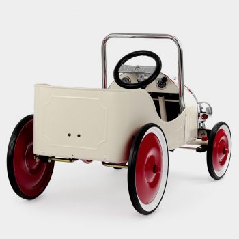The stop-sign-red vintage Legend Roadster is ready and waiting for your backyard Grand Prix. Pedal power will see your little racer zipping around with ease and agility. This pedal car features beautiful racing decal including checkered flags and 1928 Monaco race car numbering, wide wheels, beautiful chrome detailing and a red padded seat.